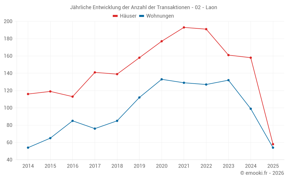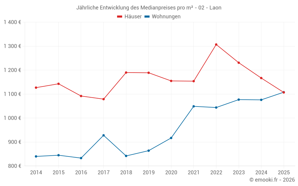 Der Durchschnittspreis auf den 26 Hausgeschäften der letzten 3 Monate in der Gemeinde Laon betrug 1 102 € pro Quadratmeter für einen mittleren Immobilienwert von 106 000 €. Über diesen Zeitraum hinweg lagen 60% der Transaktionen zwischen 836 und 1 582 € pro Quadratmeter (vom 2. bis zum 8. Dezil).