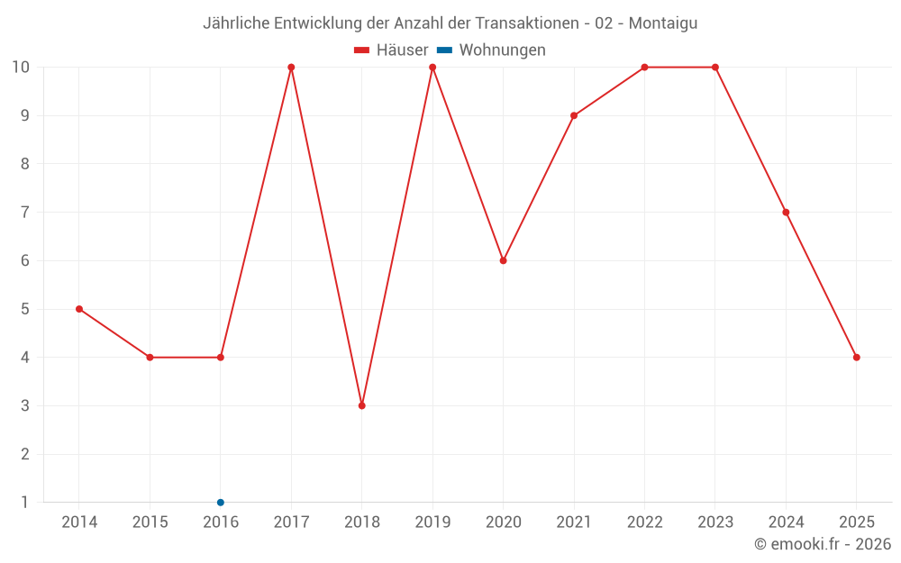 Der Durchschnittspreis auf den 18 Hausgeschäften der letzten 24 Monate in der Gemeinde Montaigu betrug 1 080 € pro Quadratmeter für einen mittleren Immobilienwert von 102 000 €. Über diesen Zeitraum hinweg lagen 60% der Transaktionen zwischen 880 und 1 325 € pro Quadratmeter (vom 2. bis zum 8. Dezil).