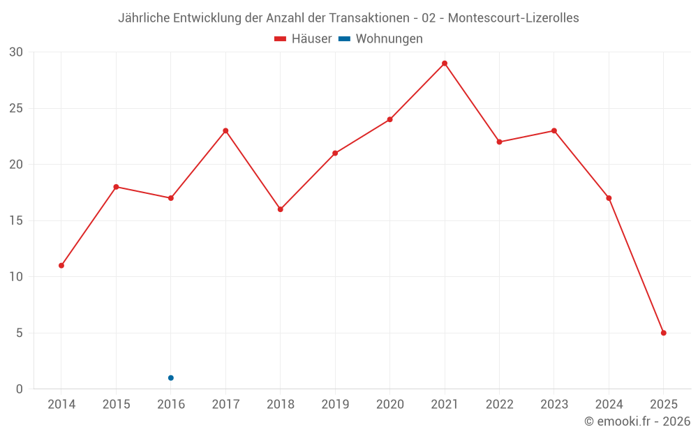 Der Durchschnittspreis auf den 16 Hausgeschäften der letzten 12 Monate in der Gemeinde Montescourt-Lizerolles betrug 1 352 € pro Quadratmeter für einen mittleren Immobilienwert von 125 050 €. Über diesen Zeitraum hinweg lagen 60% der Transaktionen zwischen 1 014 und 1 681 € pro Quadratmeter (vom 2. bis zum 8. Dezil).