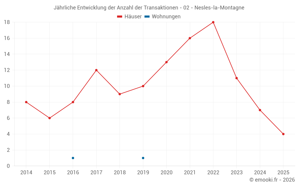 Der Durchschnittspreis auf den 17 Hausgeschäften der letzten 24 Monate in der Gemeinde Nesles-la-Montagne betrug 1 689 € pro Quadratmeter für einen mittleren Immobilienwert von 166 000 €. Über diesen Zeitraum hinweg lagen 60% der Transaktionen zwischen 1 227 und 1 998 € pro Quadratmeter (vom 2. bis zum 8. Dezil).