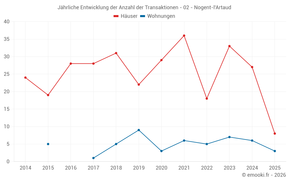 Der Durchschnittspreis auf den 23 Hausgeschäften der letzten 12 Monate in der Gemeinde Nogent-l'Artaud betrug 2 060 € pro Quadratmeter für einen mittleren Immobilienwert von 179 000 €. Über diesen Zeitraum hinweg lagen 60% der Transaktionen zwischen 1 097 und 2 559 € pro Quadratmeter (vom 2. bis zum 8. Dezil).