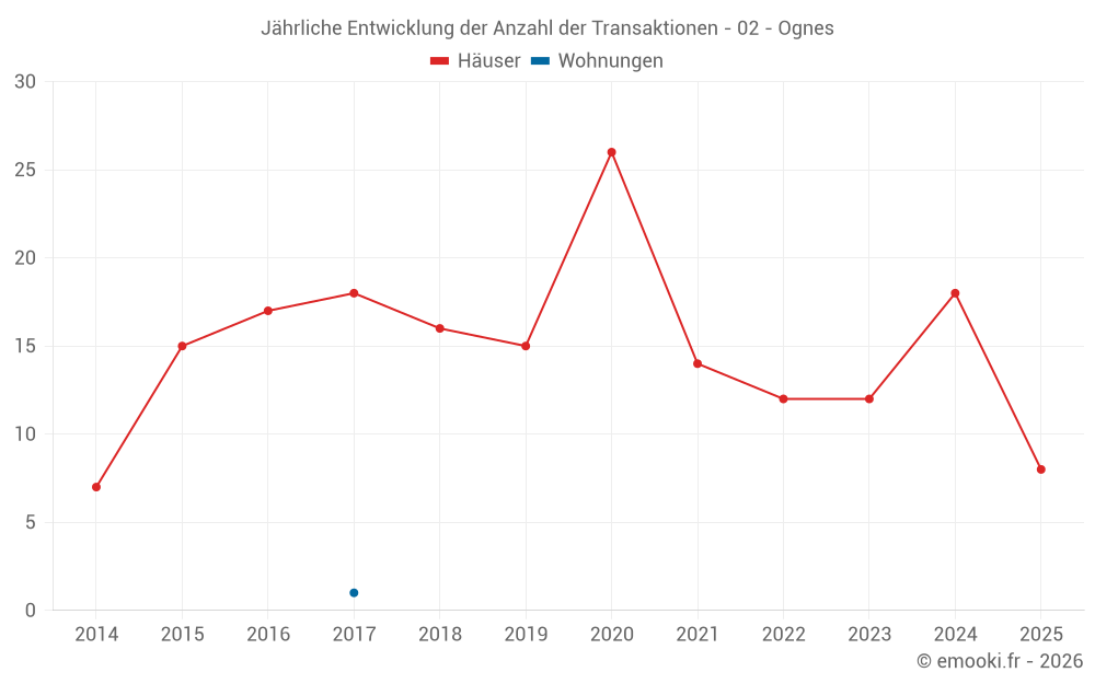 Der Durchschnittspreis auf den 19 Hausgeschäften der letzten 12 Monate in der Gemeinde Ognes betrug 1 459 € pro Quadratmeter für einen mittleren Immobilienwert von 115 000 €. Über diesen Zeitraum hinweg lagen 60% der Transaktionen zwischen 977 und 1 781 € pro Quadratmeter (vom 2. bis zum 8. Dezil).