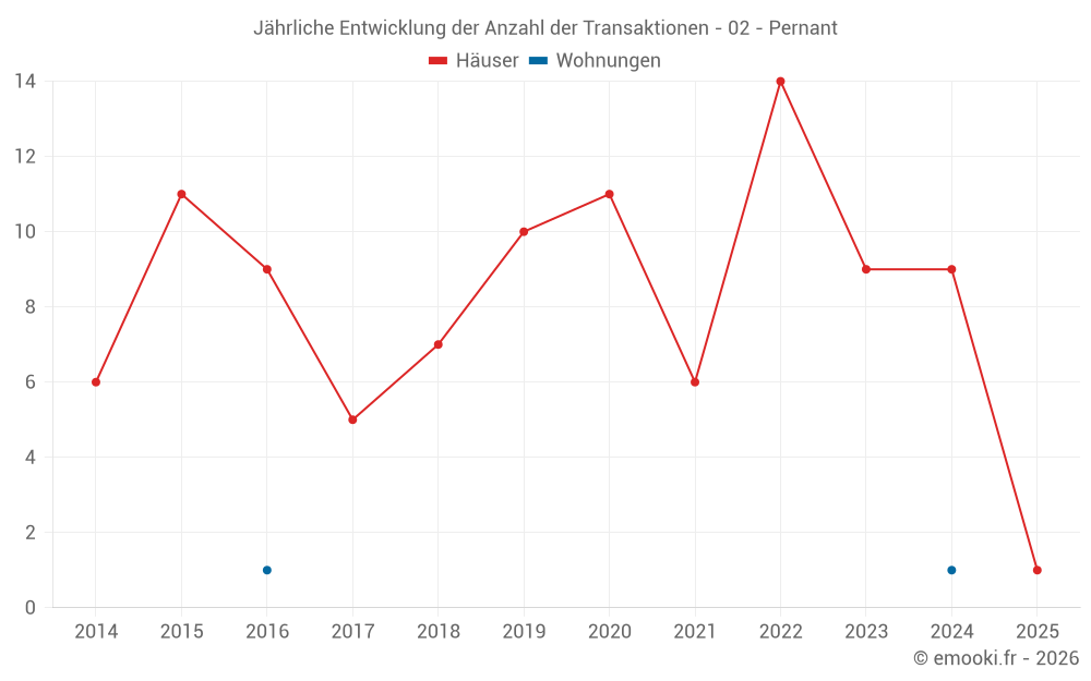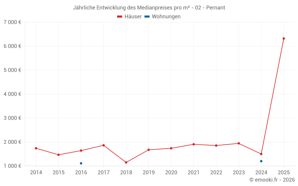 Der Durchschnittspreis auf den 17 Hausgeschäften der letzten 24 Monate in der Gemeinde Pernant betrug 1 667 € pro Quadratmeter für einen mittleren Immobilienwert von 150 000 €. Über diesen Zeitraum hinweg lagen 60% der Transaktionen zwischen 1 433 und 2 330 € pro Quadratmeter (vom 2. bis zum 8. Dezil).