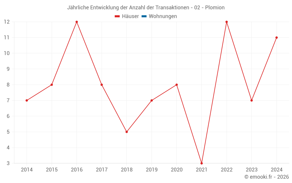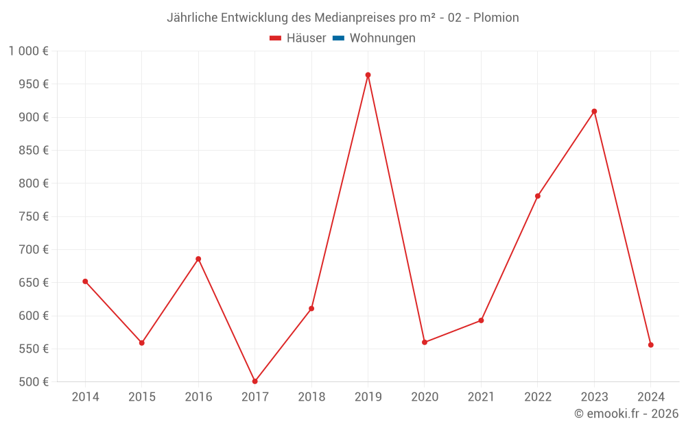 Der Durchschnittspreis auf den 14 Hausgeschäften der letzten 24 Monate in der Gemeinde Plomion betrug 528 € pro Quadratmeter für einen mittleren Immobilienwert von 47 500 €. Über diesen Zeitraum hinweg lagen 60% der Transaktionen zwischen 249 und 804 € pro Quadratmeter (vom 2. bis zum 8. Dezil).