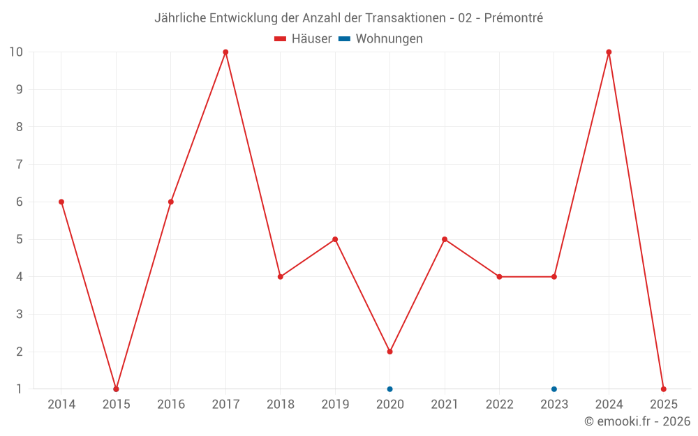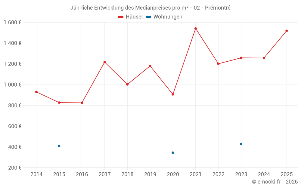 Der Durchschnittspreis auf den 14 Hausgeschäften der letzten 24 Monate in der Gemeinde Prémontré betrug 1 312 € pro Quadratmeter für einen mittleren Immobilienwert von 104 500 €. Über diesen Zeitraum hinweg lagen 60% der Transaktionen zwischen 1 099 und 1 497 € pro Quadratmeter (vom 2. bis zum 8. Dezil).