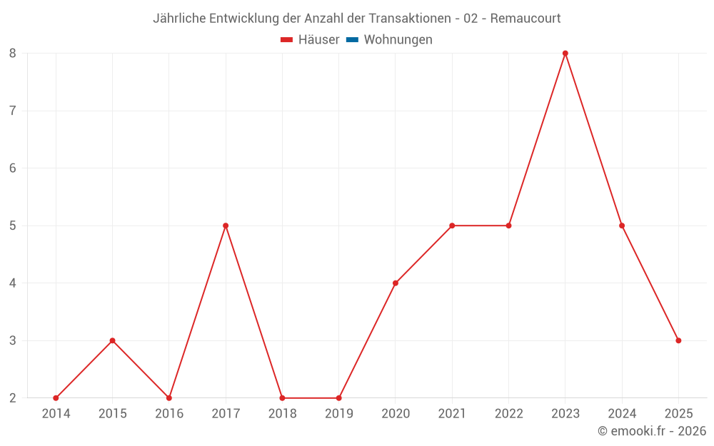 Der Durchschnittspreis auf den 15 Hausgeschäften der letzten 24 Monate in der Gemeinde Remaucourt betrug 1 046 € pro Quadratmeter für einen mittleren Immobilienwert von 115 000 €. Über diesen Zeitraum hinweg lagen 60% der Transaktionen zwischen 792 und 1 525 € pro Quadratmeter (vom 2. bis zum 8. Dezil).