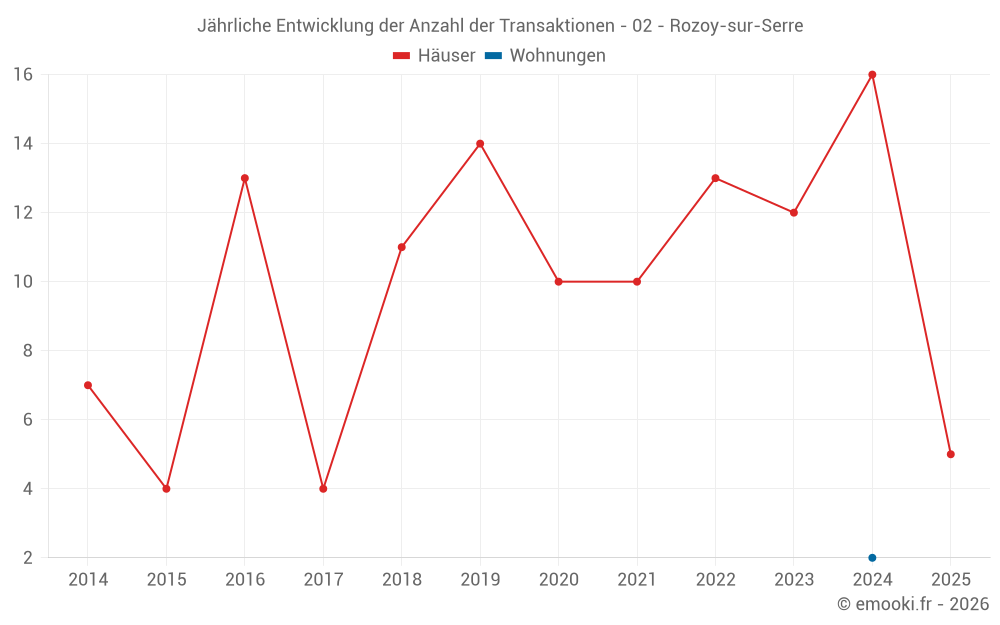 Der Durchschnittspreis auf den 29 Hausgeschäften der letzten 24 Monate in der Gemeinde Rozoy-sur-Serre betrug 491 € pro Quadratmeter für einen mittleren Immobilienwert von 50 000 €. Über diesen Zeitraum hinweg lagen 60% der Transaktionen zwischen 283 und 808 € pro Quadratmeter (vom 2. bis zum 8. Dezil).