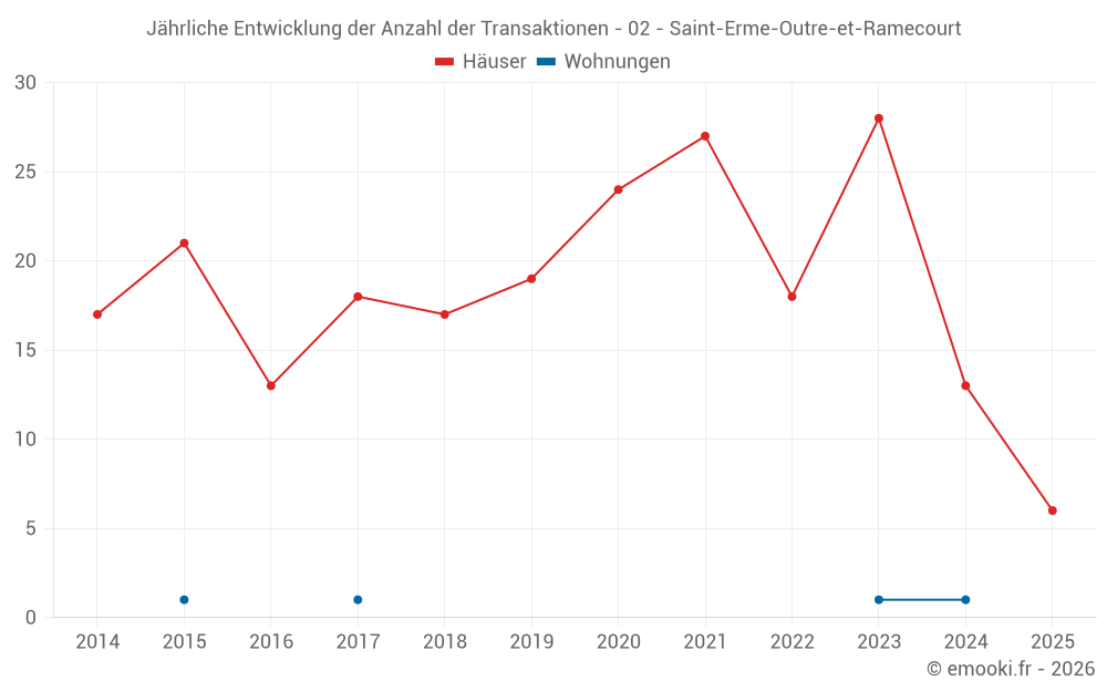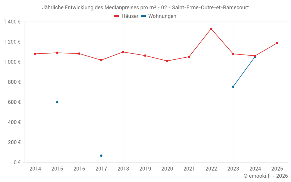 Der Durchschnittspreis auf den 34 Hausgeschäften der letzten 24 Monate in der Gemeinde Saint-Erme-Outre-et-Ramecourt betrug 1 109 € pro Quadratmeter für einen mittleren Immobilienwert von 117 475 €. Über diesen Zeitraum hinweg lagen 60% der Transaktionen zwischen 622 und 1 495 € pro Quadratmeter (vom 2. bis zum 8. Dezil).