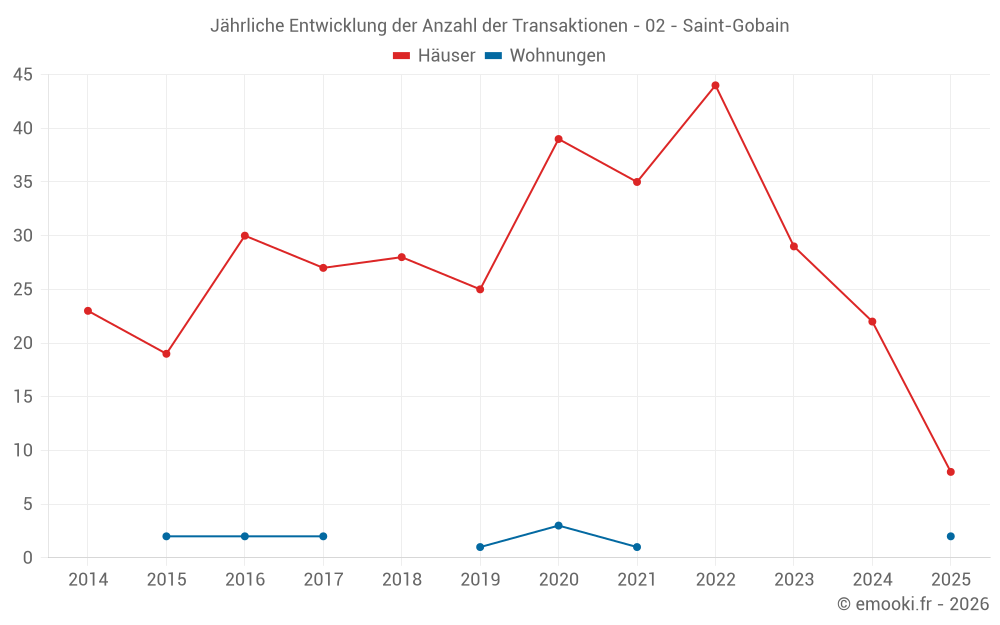 Der Durchschnittspreis auf den 21 Hausgeschäften der letzten 12 Monate in der Gemeinde Saint-Gobain betrug 1 125 € pro Quadratmeter für einen mittleren Immobilienwert von 77 000 €. Über diesen Zeitraum hinweg lagen 60% der Transaktionen zwischen 857 und 1 352 € pro Quadratmeter (vom 2. bis zum 8. Dezil).