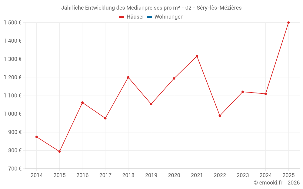 Der Durchschnittspreis auf den 16 Hausgeschäften der letzten 24 Monate in der Gemeinde Séry-lès-Mézières betrug 1 200 € pro Quadratmeter für einen mittleren Immobilienwert von 129 950 €. Über diesen Zeitraum hinweg lagen 60% der Transaktionen zwischen 960 und 1 681 € pro Quadratmeter (vom 2. bis zum 8. Dezil).
