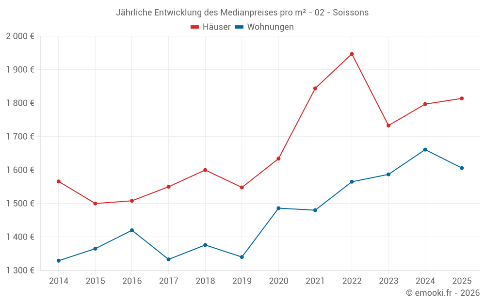 Der Durchschnittspreis auf den 28 Hausgeschäften der letzten 3 Monate in der Gemeinde Soissons betrug 2 025 € pro Quadratmeter für einen mittleren Immobilienwert von 184 000 €. Über diesen Zeitraum hinweg lagen 60% der Transaktionen zwischen 1 584 und 2 355 € pro Quadratmeter (vom 2. bis zum 8. Dezil).