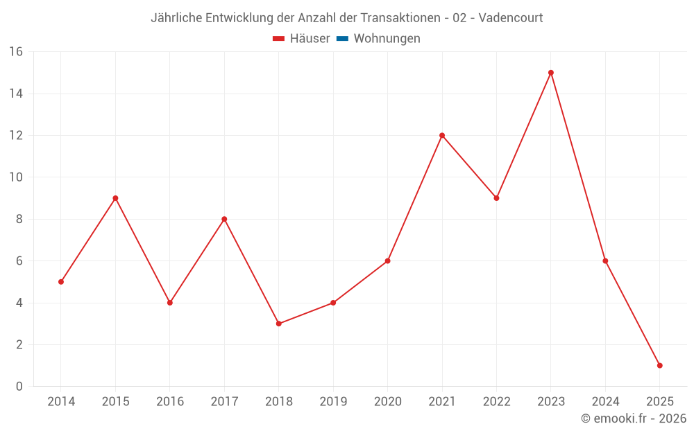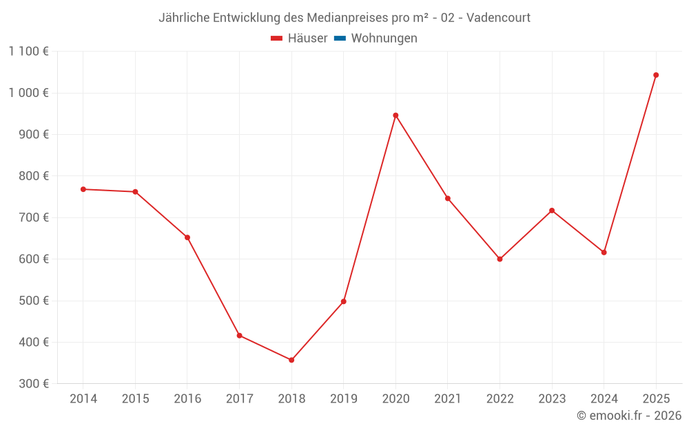Der Durchschnittspreis auf den 16 Hausgeschäften der letzten 24 Monate in der Gemeinde Vadencourt betrug 742 € pro Quadratmeter für einen mittleren Immobilienwert von 90 000 €. Über diesen Zeitraum hinweg lagen 60% der Transaktionen zwischen 462 und 1 027 € pro Quadratmeter (vom 2. bis zum 8. Dezil).