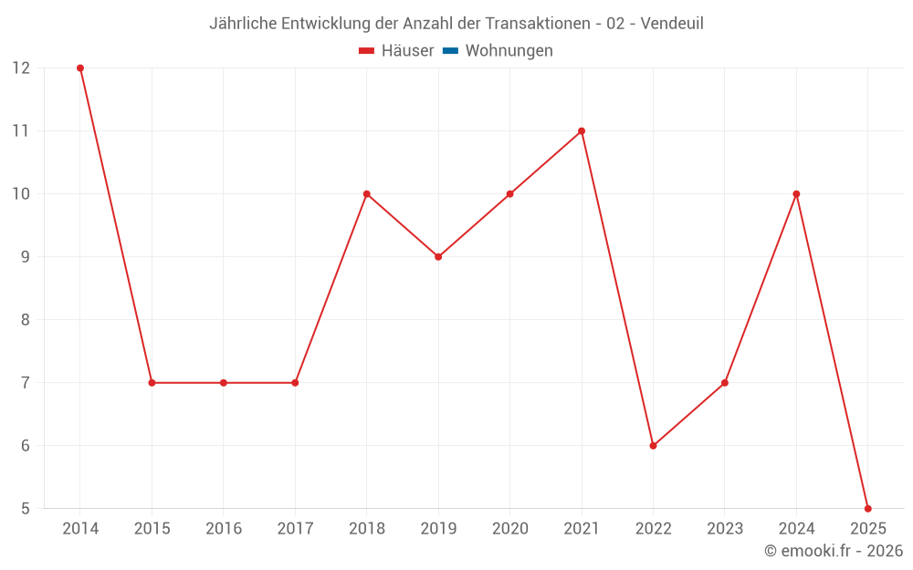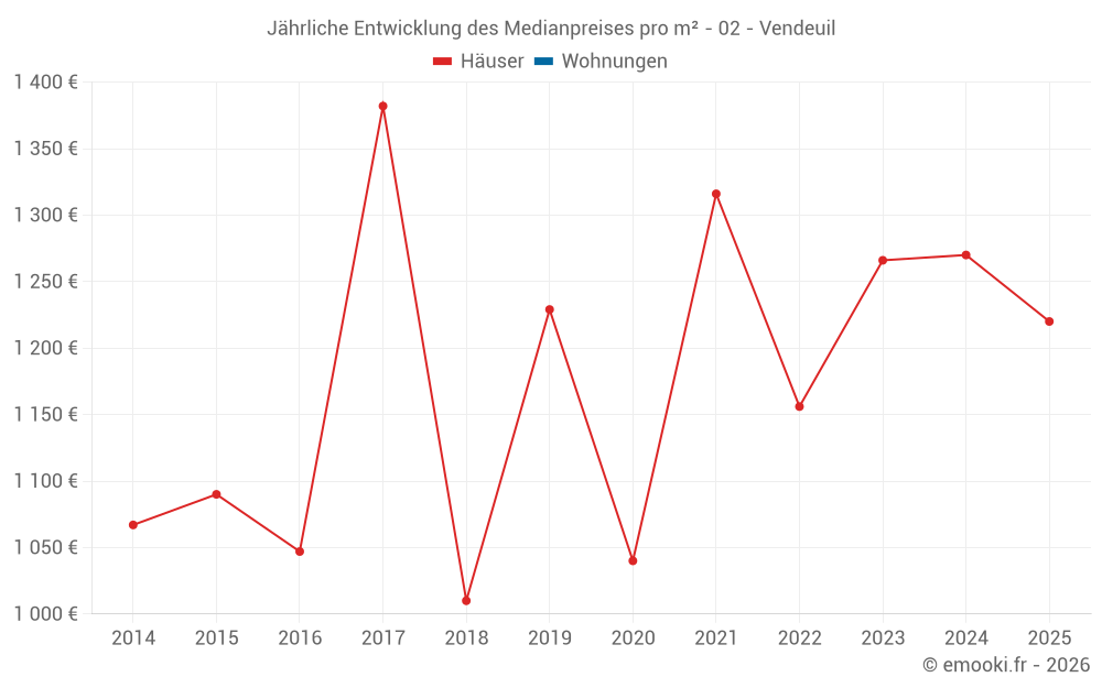 Der Durchschnittspreis auf den 20 Hausgeschäften der letzten 24 Monate in der Gemeinde Vendeuil betrug 1 262 € pro Quadratmeter für einen mittleren Immobilienwert von 89 950 €. Über diesen Zeitraum hinweg lagen 60% der Transaktionen zwischen 1 041 und 1 670 € pro Quadratmeter (vom 2. bis zum 8. Dezil).