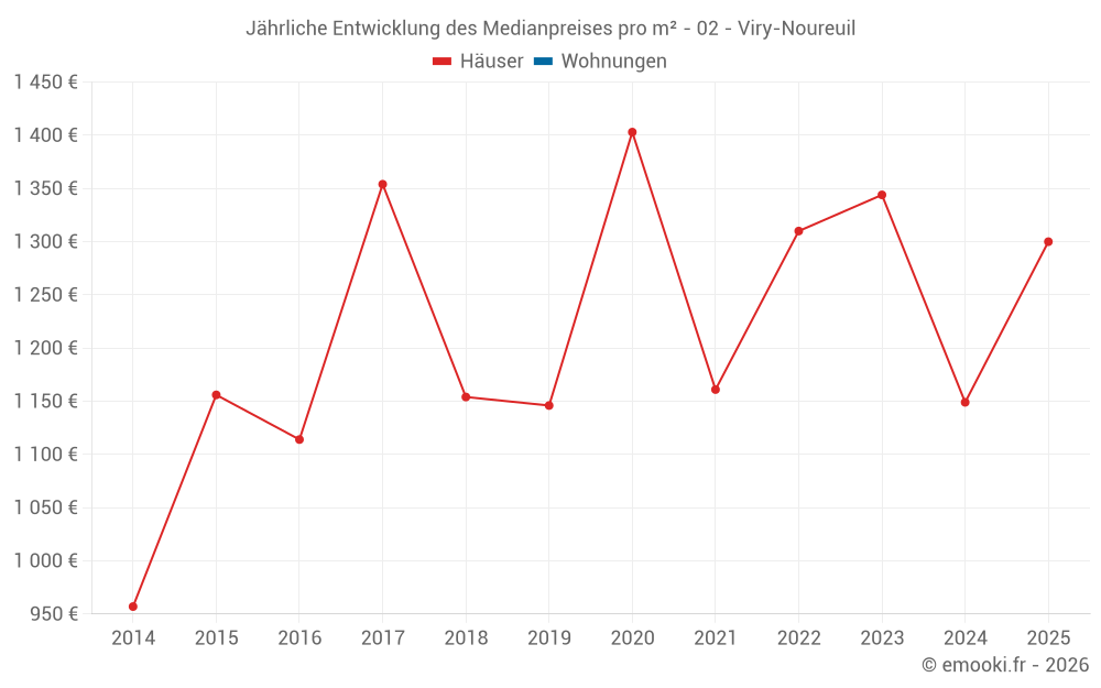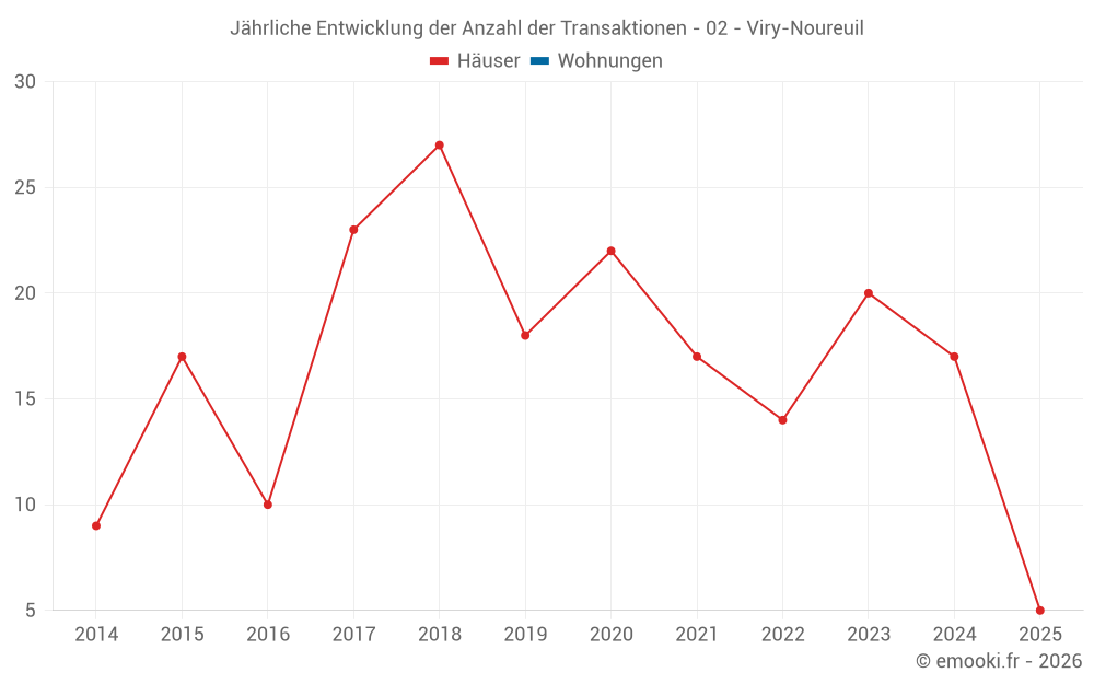 Der Durchschnittspreis auf den 16 Hausgeschäften der letzten 12 Monate in der Gemeinde Viry-Noureuil betrug 1 196 € pro Quadratmeter für einen mittleren Immobilienwert von 123 000 €. Über diesen Zeitraum hinweg lagen 60% der Transaktionen zwischen 600 und 1 333 € pro Quadratmeter (vom 2. bis zum 8. Dezil).