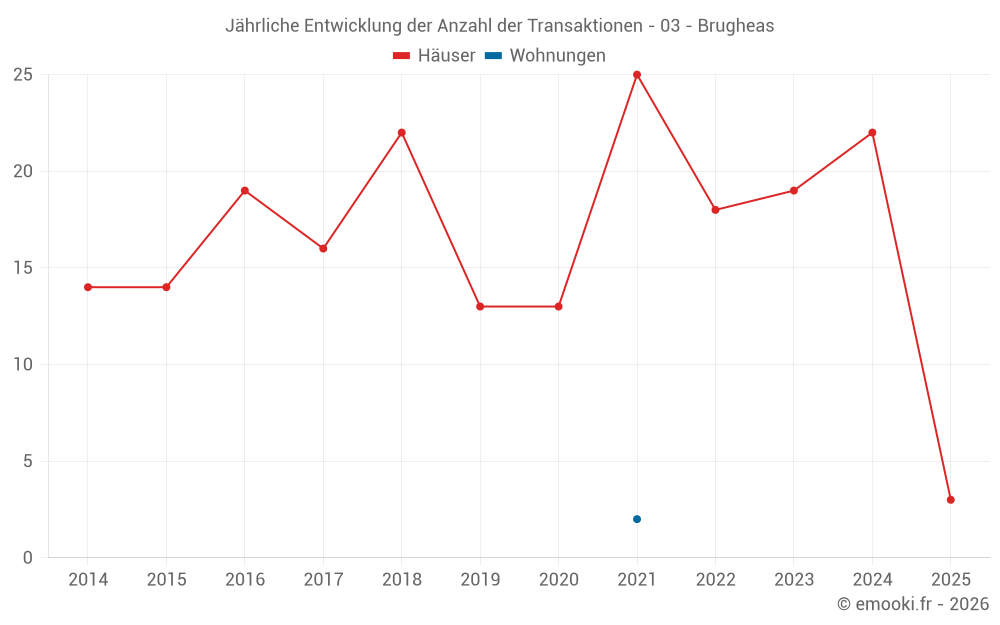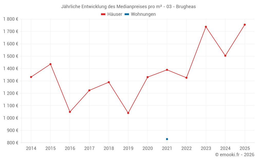 Der Durchschnittspreis auf den 18 Hausgeschäften der letzten 12 Monate in der Gemeinde Brugheas betrug 1 504 € pro Quadratmeter für einen mittleren Immobilienwert von 189 550 €. Über diesen Zeitraum hinweg lagen 60% der Transaktionen zwischen 1 175 und 2 081 € pro Quadratmeter (vom 2. bis zum 8. Dezil).