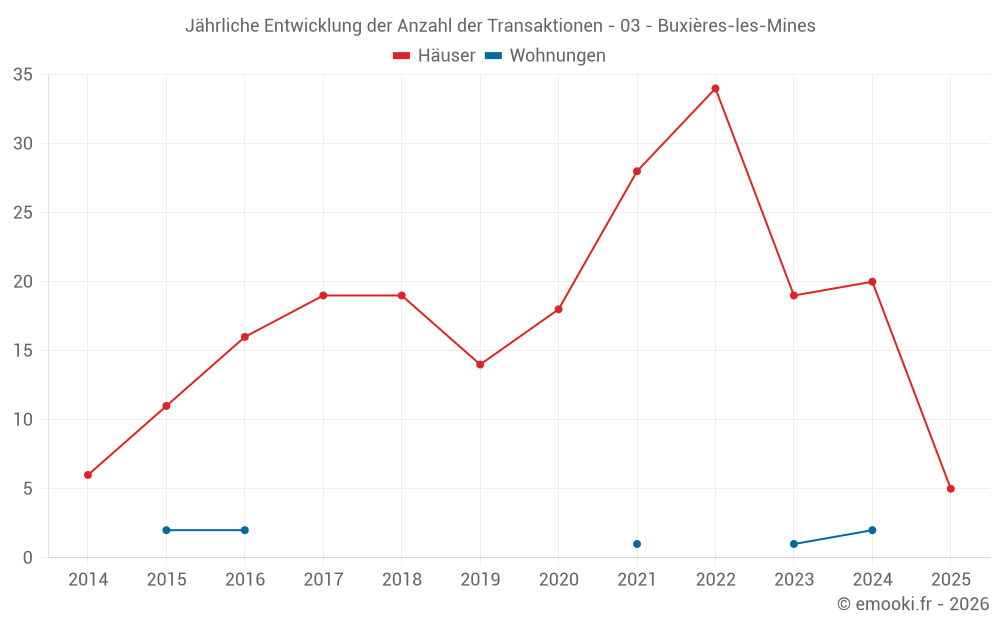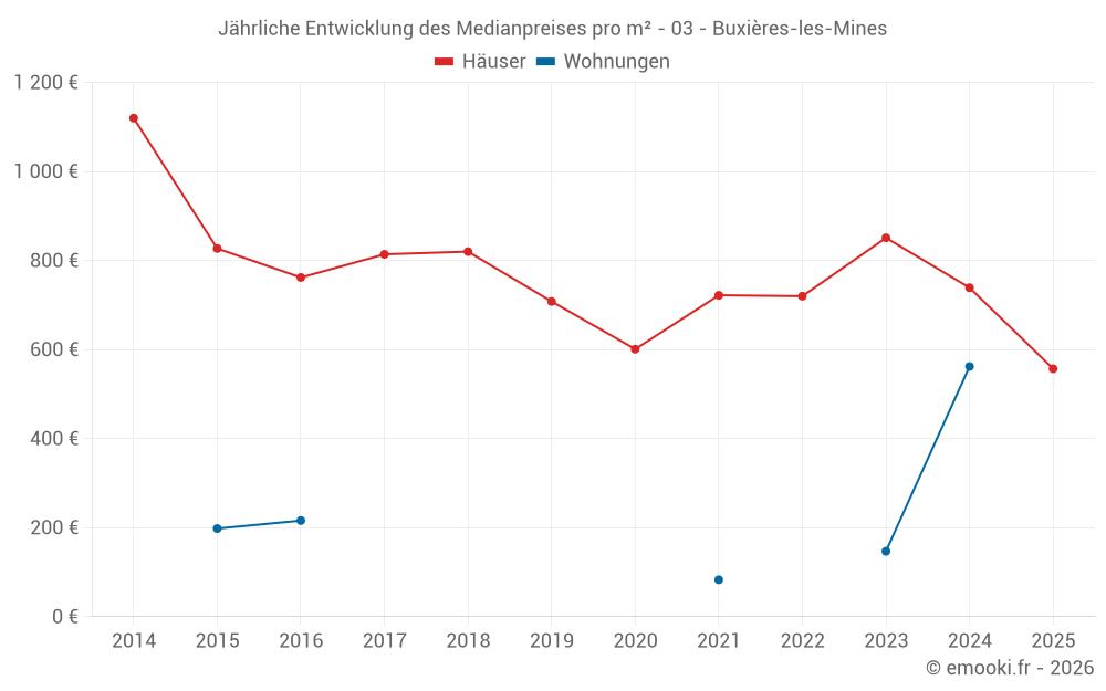 Der Durchschnittspreis auf den 30 Hausgeschäften der letzten 24 Monate in der Gemeinde Buxières-les-Mines betrug 739 € pro Quadratmeter für einen mittleren Immobilienwert von 56 500 €. Über diesen Zeitraum hinweg lagen 60% der Transaktionen zwischen 458 und 1 251 € pro Quadratmeter (vom 2. bis zum 8. Dezil).