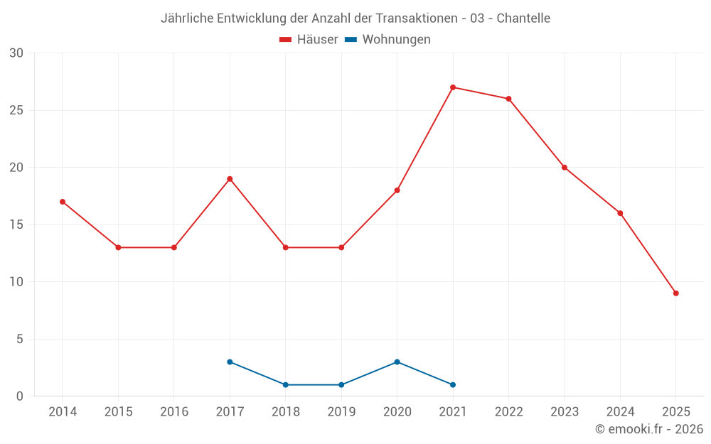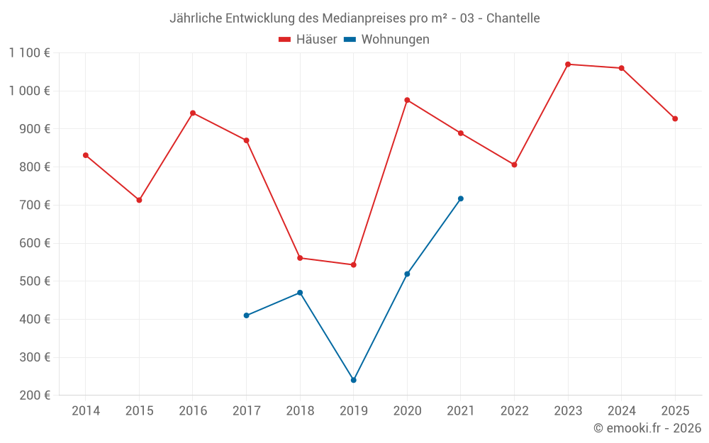 Der Durchschnittspreis auf den 16 Hausgeschäften der letzten 12 Monate in der Gemeinde Chantelle betrug 1 064 € pro Quadratmeter für einen mittleren Immobilienwert von 85 995 €. Über diesen Zeitraum hinweg lagen 60% der Transaktionen zwischen 482 und 1 298 € pro Quadratmeter (vom 2. bis zum 8. Dezil).