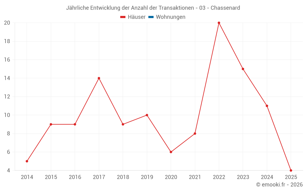Der Durchschnittspreis auf den 27 Hausgeschäften der letzten 24 Monate in der Gemeinde Chassenard betrug 1 153 € pro Quadratmeter für einen mittleren Immobilienwert von 100 000 €. Über diesen Zeitraum hinweg lagen 60% der Transaktionen zwischen 533 und 1 655 € pro Quadratmeter (vom 2. bis zum 8. Dezil).