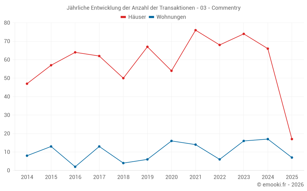 Der Durchschnittspreis auf den 55 Hausgeschäften der letzten 12 Monate in der Gemeinde Commentry betrug 954 € pro Quadratmeter für einen mittleren Immobilienwert von 75 000 €. Über diesen Zeitraum hinweg lagen 60% der Transaktionen zwischen 493 und 1 249 € pro Quadratmeter (vom 2. bis zum 8. Dezil).