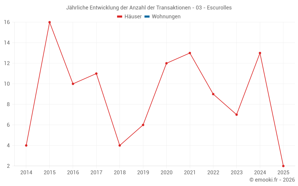 Der Durchschnittspreis auf den 20 Hausgeschäften der letzten 24 Monate in der Gemeinde Escurolles betrug 1 110 € pro Quadratmeter für einen mittleren Immobilienwert von 129 250 €. Über diesen Zeitraum hinweg lagen 60% der Transaktionen zwischen 663 und 1 854 € pro Quadratmeter (vom 2. bis zum 8. Dezil).