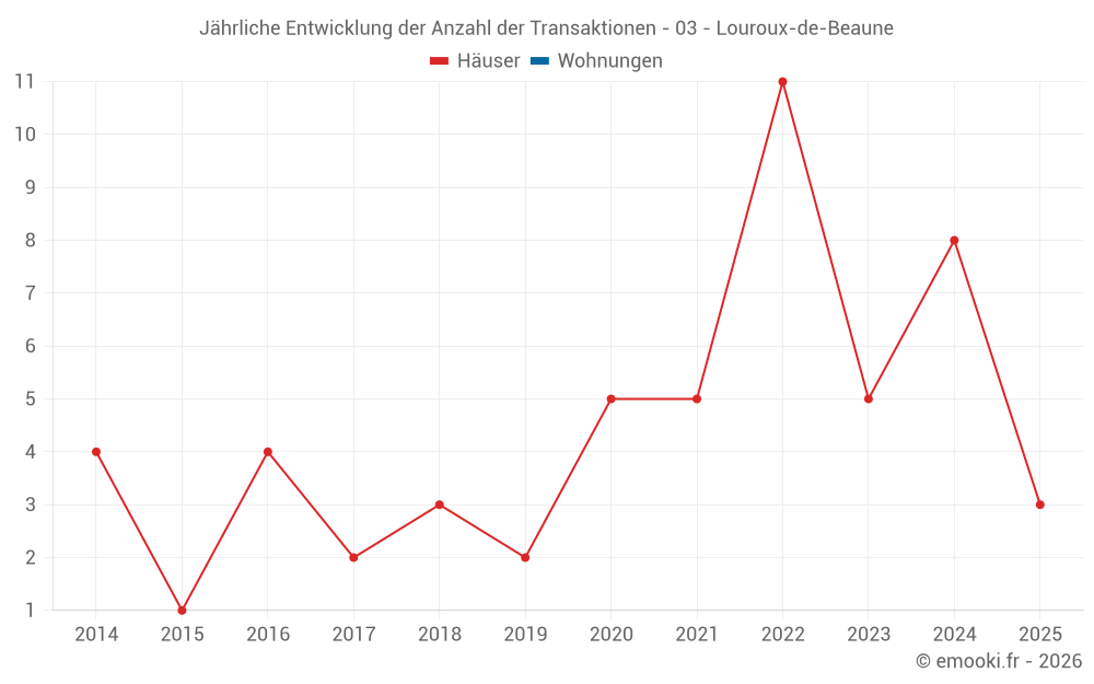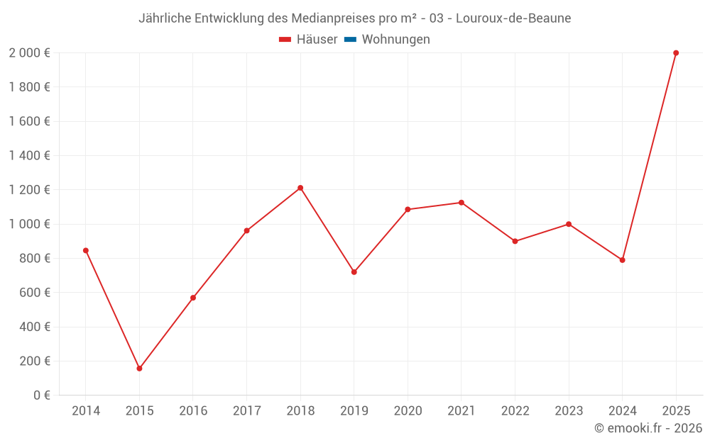 Der Durchschnittspreis auf den 14 Hausgeschäften der letzten 24 Monate in der Gemeinde Louroux-de-Beaune betrug 937 € pro Quadratmeter für einen mittleren Immobilienwert von 110 000 €. Über diesen Zeitraum hinweg lagen 60% der Transaktionen zwischen 593 und 1 903 € pro Quadratmeter (vom 2. bis zum 8. Dezil).