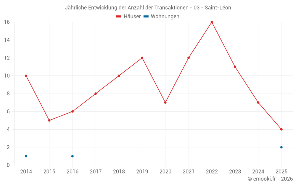 Der Durchschnittspreis auf den 16 Hausgeschäften der letzten 24 Monate in der Gemeinde Saint-Léon betrug 670 € pro Quadratmeter für einen mittleren Immobilienwert von 46 250 €. Über diesen Zeitraum hinweg lagen 60% der Transaktionen zwischen 339 und 1 142 € pro Quadratmeter (vom 2. bis zum 8. Dezil).