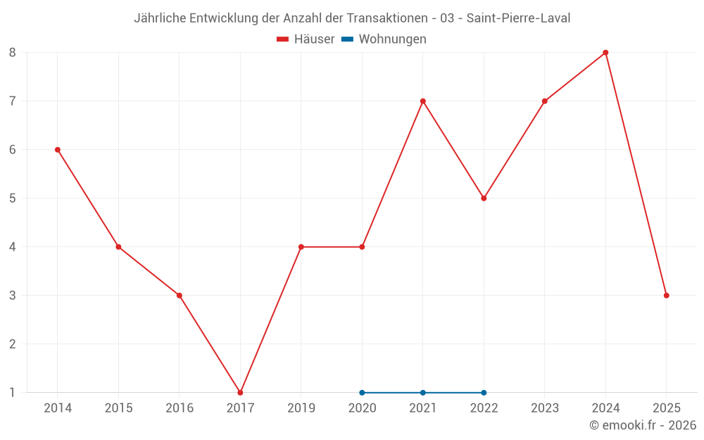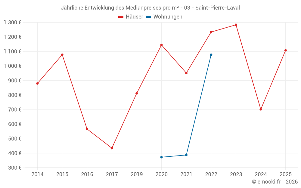 Der Durchschnittspreis auf den 14 Hausgeschäften der letzten 24 Monate in der Gemeinde Saint-Pierre-Laval betrug 968 € pro Quadratmeter für einen mittleren Immobilienwert von 87 500 €. Über diesen Zeitraum hinweg lagen 60% der Transaktionen zwischen 530 und 1 706 € pro Quadratmeter (vom 2. bis zum 8. Dezil).