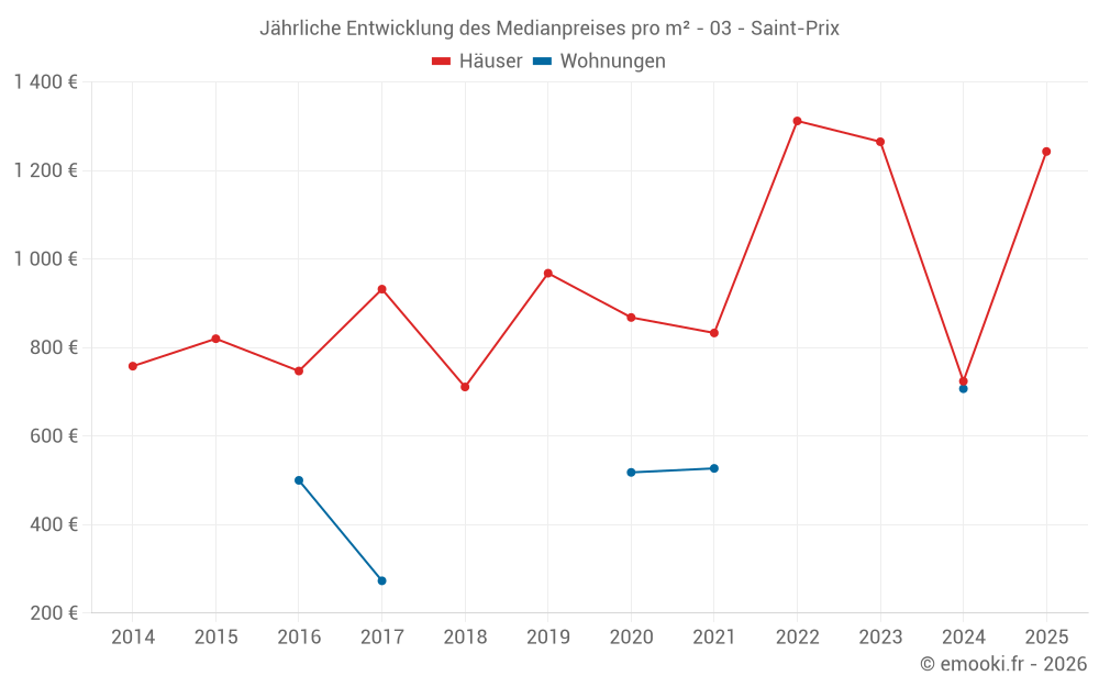 Der Durchschnittspreis auf den 25 Hausgeschäften der letzten 24 Monate in der Gemeinde Saint-Prix betrug 883 € pro Quadratmeter für einen mittleren Immobilienwert von 75 000 €. Über diesen Zeitraum hinweg lagen 60% der Transaktionen zwischen 498 und 1 349 € pro Quadratmeter (vom 2. bis zum 8. Dezil).
