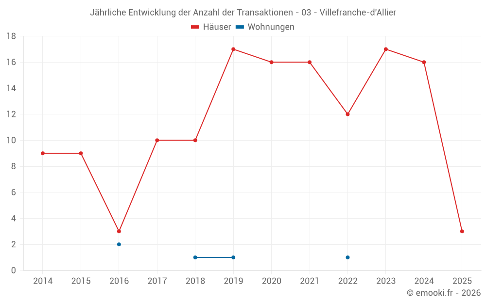Der Durchschnittspreis auf den 26 Hausgeschäften der letzten 24 Monate in der Gemeinde Villefranche-d'Allier betrug 912 € pro Quadratmeter für einen mittleren Immobilienwert von 83 275 €. Über diesen Zeitraum hinweg lagen 60% der Transaktionen zwischen 524 und 1 625 € pro Quadratmeter (vom 2. bis zum 8. Dezil).