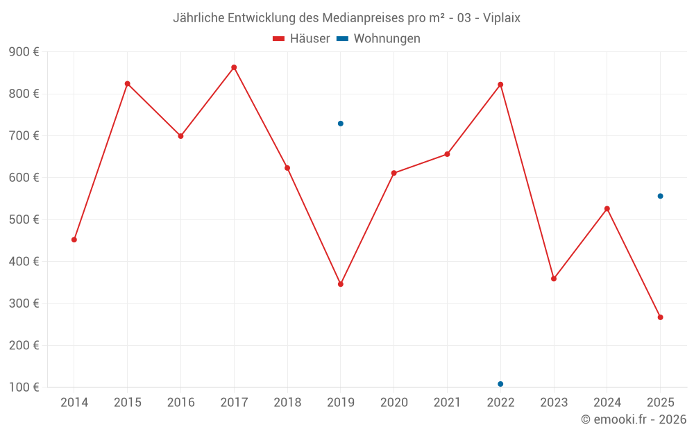 Der Durchschnittspreis auf den 17 Hausgeschäften der letzten 24 Monate in der Gemeinde Viplaix betrug 516 € pro Quadratmeter für einen mittleren Immobilienwert von 40 000 €. Über diesen Zeitraum hinweg lagen 60% der Transaktionen zwischen 241 und 764 € pro Quadratmeter (vom 2. bis zum 8. Dezil).