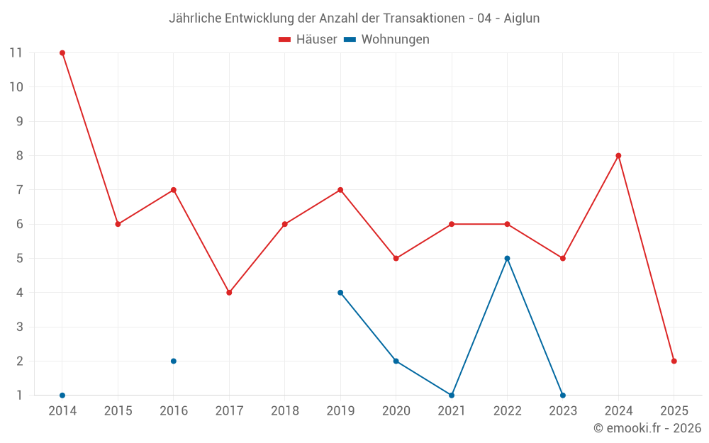 Der Durchschnittspreis auf den 14 Hausgeschäften der letzten 24 Monate in der Gemeinde Aiglun betrug 2 083 € pro Quadratmeter für einen mittleren Immobilienwert von 260 750 €. Über diesen Zeitraum hinweg lagen 60% der Transaktionen zwischen 1 714 und 2 913 € pro Quadratmeter (vom 2. bis zum 8. Dezil).
