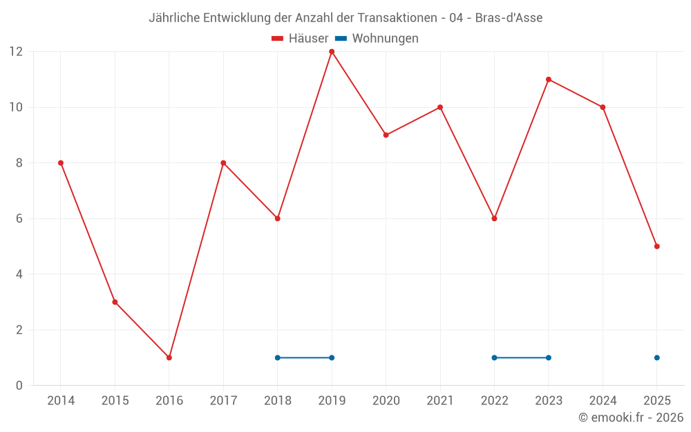 Der Durchschnittspreis auf den 21 Hausgeschäften der letzten 24 Monate in der Gemeinde Bras-d'Asse betrug 2 278 € pro Quadratmeter für einen mittleren Immobilienwert von 190 000 €. Über diesen Zeitraum hinweg lagen 60% der Transaktionen zwischen 1 557 und 2 701 € pro Quadratmeter (vom 2. bis zum 8. Dezil).