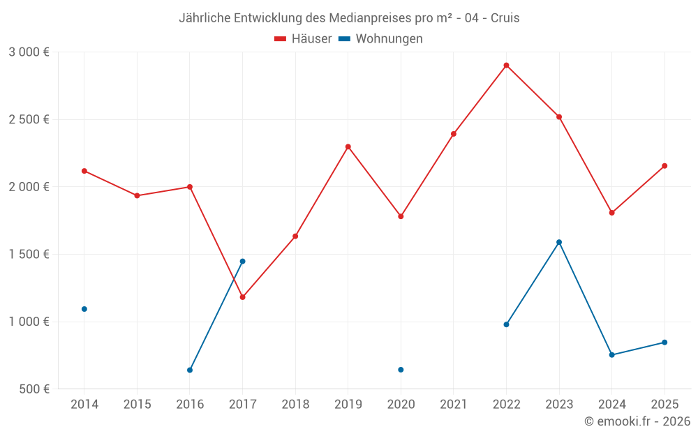 Der Durchschnittspreis auf den 27 Hausgeschäften der letzten 24 Monate in der Gemeinde Cruis betrug 1 983 € pro Quadratmeter für einen mittleren Immobilienwert von 155 000 €. Über diesen Zeitraum hinweg lagen 60% der Transaktionen zwischen 1 248 und 3 054 € pro Quadratmeter (vom 2. bis zum 8. Dezil).