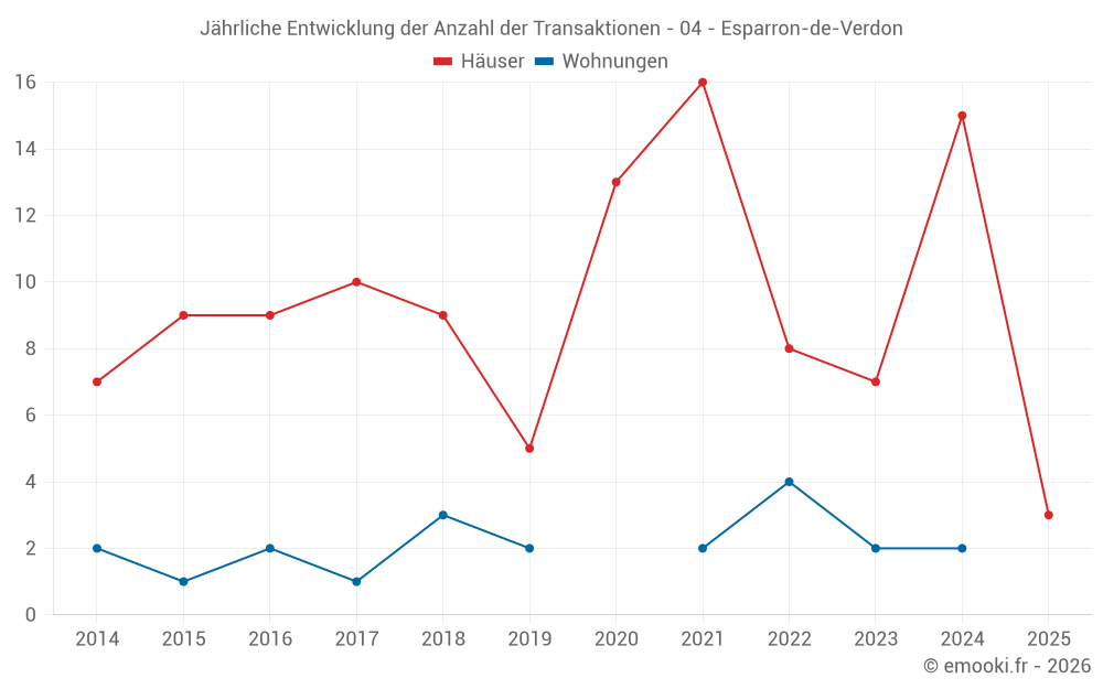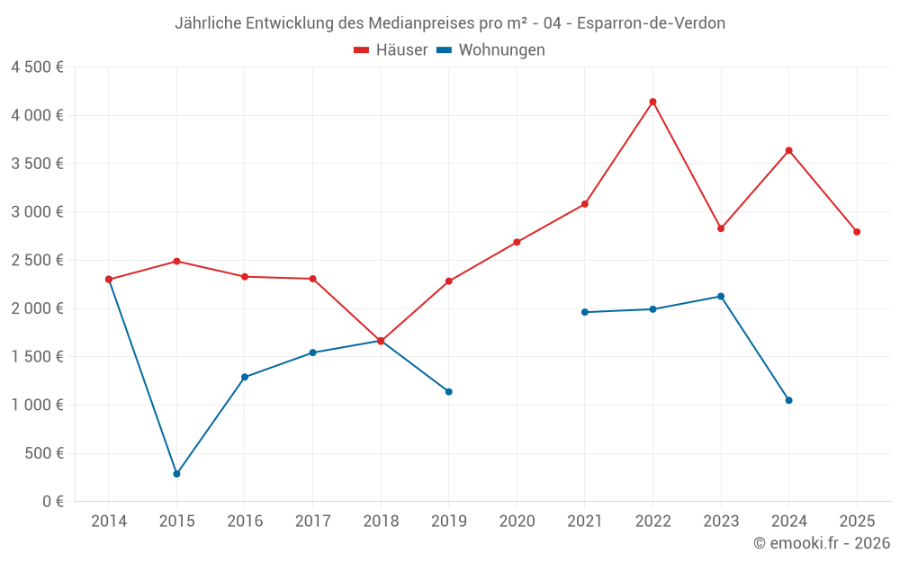 Der Durchschnittspreis auf den 24 Hausgeschäften der letzten 24 Monate in der Gemeinde Esparron-de-Verdon betrug 3 124 € pro Quadratmeter für einen mittleren Immobilienwert von 251 375 €. Über diesen Zeitraum hinweg lagen 60% der Transaktionen zwischen 1 660 und 4 579 € pro Quadratmeter (vom 2. bis zum 8. Dezil).