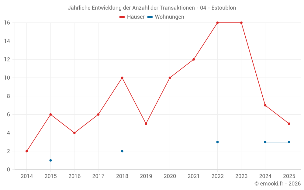 Der Durchschnittspreis auf den 20 Hausgeschäften der letzten 24 Monate in der Gemeinde Estoublon betrug 2 365 € pro Quadratmeter für einen mittleren Immobilienwert von 205 000 €. Über diesen Zeitraum hinweg lagen 60% der Transaktionen zwischen 1 284 und 2 839 € pro Quadratmeter (vom 2. bis zum 8. Dezil).