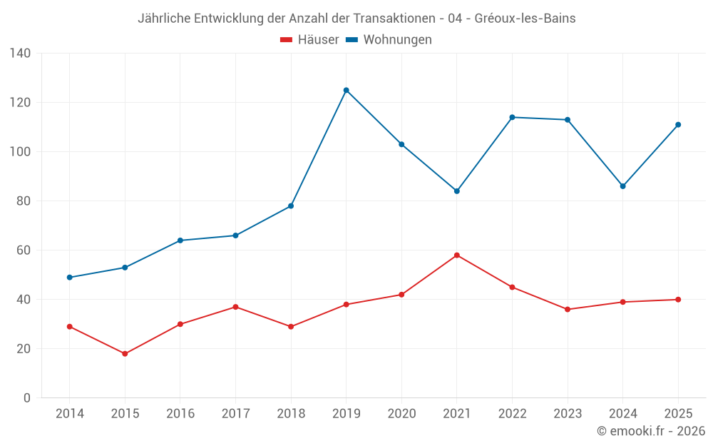 Der Durchschnittspreis auf den 39 Hausgeschäften der letzten 12 Monate in der Gemeinde Gréoux-les-Bains betrug 3 319 € pro Quadratmeter für einen mittleren Immobilienwert von 262 300 €. Über diesen Zeitraum hinweg lagen 60% der Transaktionen zwischen 2 309 und 3 906 € pro Quadratmeter (vom 2. bis zum 8. Dezil).