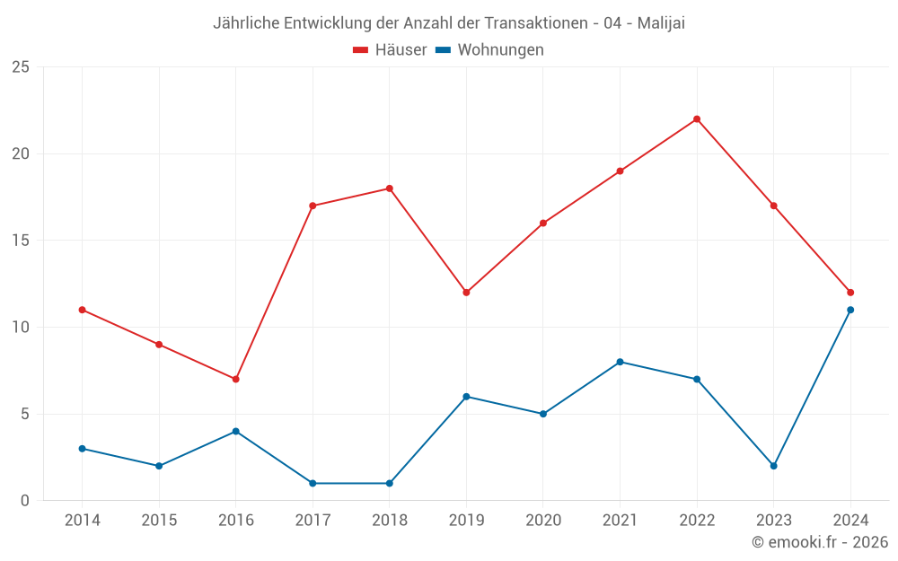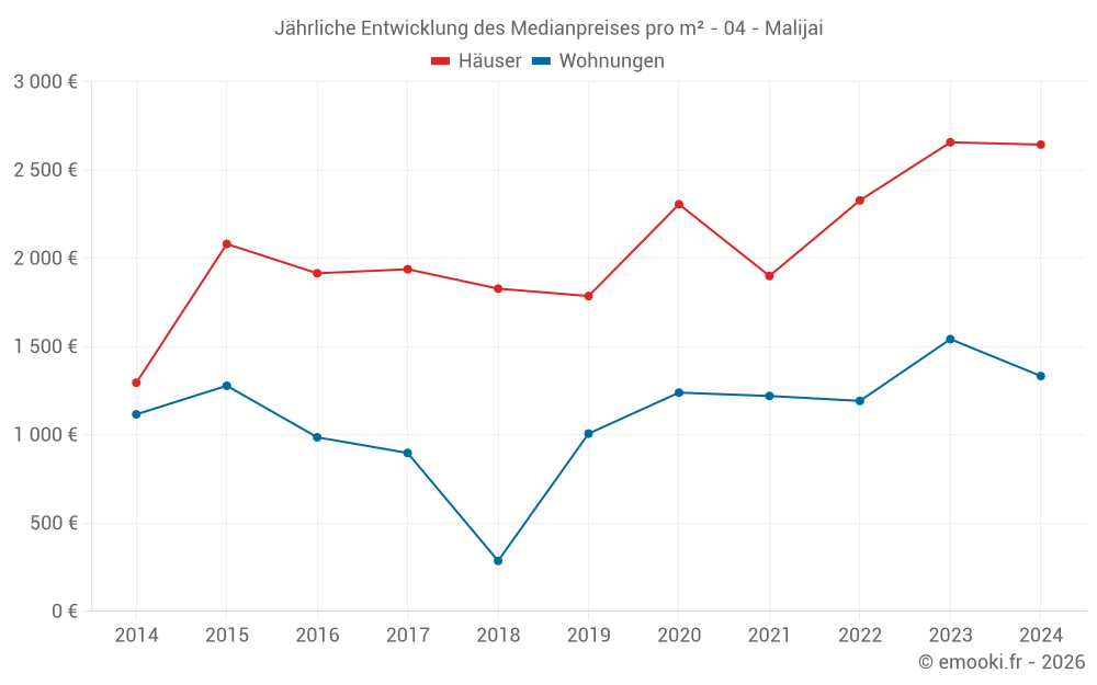 Der Durchschnittspreis auf den 22 Hausgeschäften der letzten 24 Monate in der Gemeinde Malijai betrug 2 378 € pro Quadratmeter für einen mittleren Immobilienwert von 205 625 €. Über diesen Zeitraum hinweg lagen 60% der Transaktionen zwischen 1 375 und 2 940 € pro Quadratmeter (vom 2. bis zum 8. Dezil).