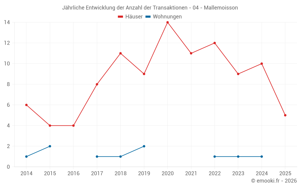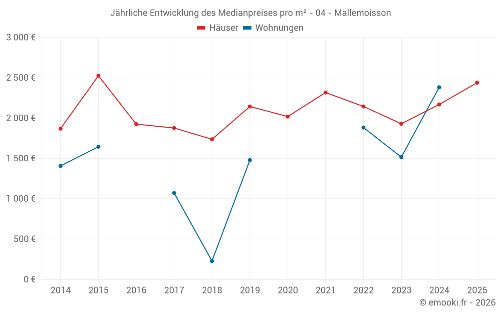 Der Durchschnittspreis auf den 18 Hausgeschäften der letzten 24 Monate in der Gemeinde Mallemoisson betrug 2 204 € pro Quadratmeter für einen mittleren Immobilienwert von 192 500 €. Über diesen Zeitraum hinweg lagen 60% der Transaktionen zwischen 1 537 und 2 916 € pro Quadratmeter (vom 2. bis zum 8. Dezil).