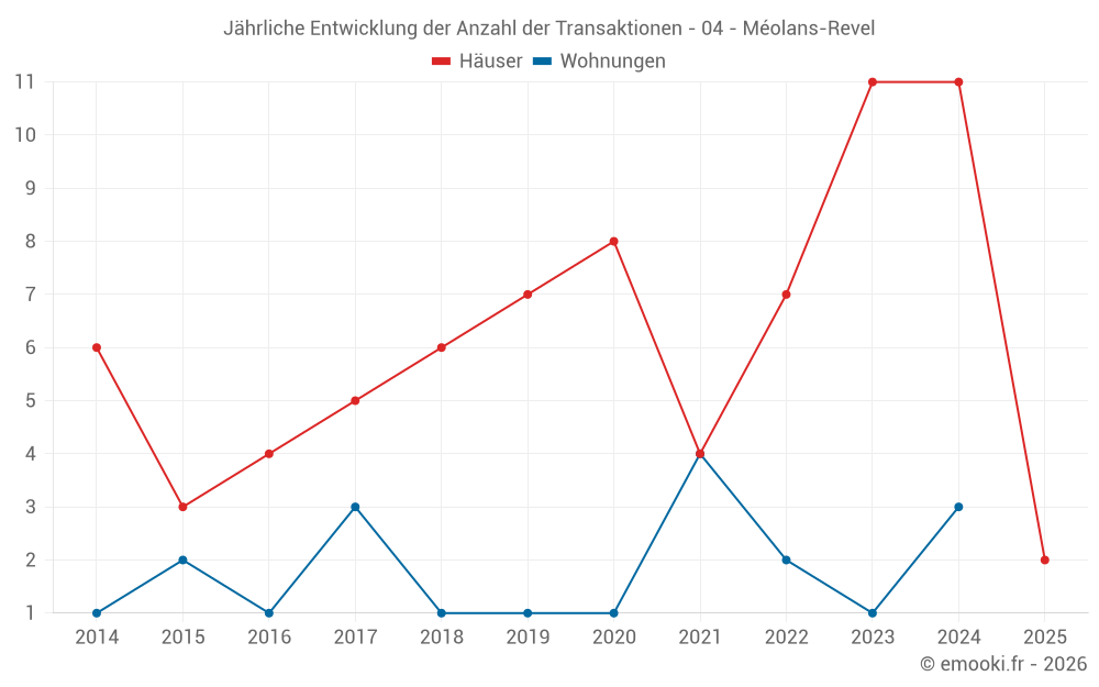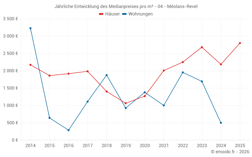 Der Durchschnittspreis auf den 17 Hausgeschäften der letzten 24 Monate in der Gemeinde Méolans-Revel betrug 2 297 € pro Quadratmeter für einen mittleren Immobilienwert von 153 000 €. Über diesen Zeitraum hinweg lagen 60% der Transaktionen zwischen 1 155 und 3 578 € pro Quadratmeter (vom 2. bis zum 8. Dezil).
