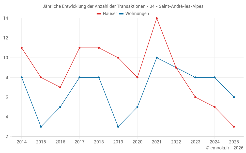 Der Durchschnittspreis auf den 19 Wohnungstransaktionen der letzten 24 Monate in der Gemeinde Saint-André-les-Alpes betrug 1 432 € pro Quadratmeter für einen mittleren Immobilienwert von 109 500 €. Über diesen Zeitraum hinweg lagen 60% der Transaktionen zwischen 1 013 und 2 058 € pro Quadratmeter (vom 2. bis zum 8. Dezil).