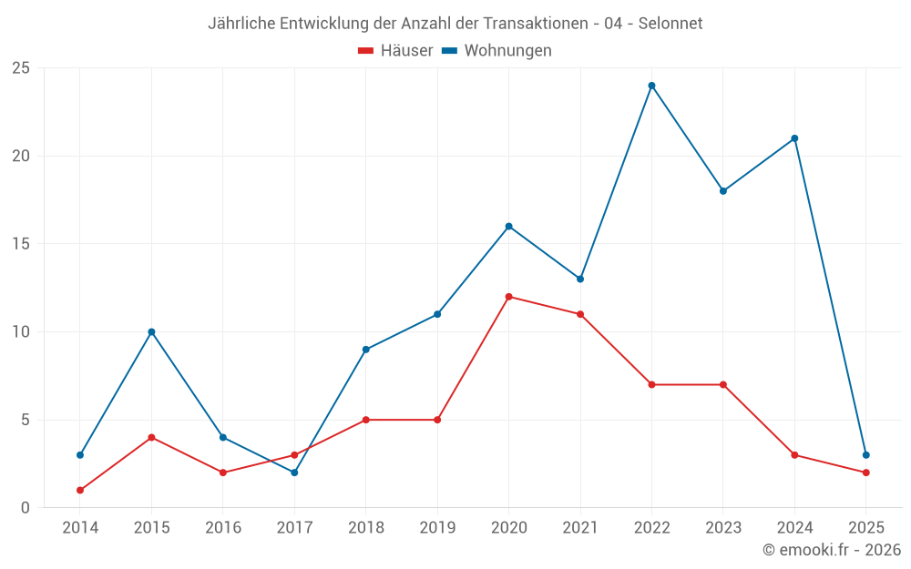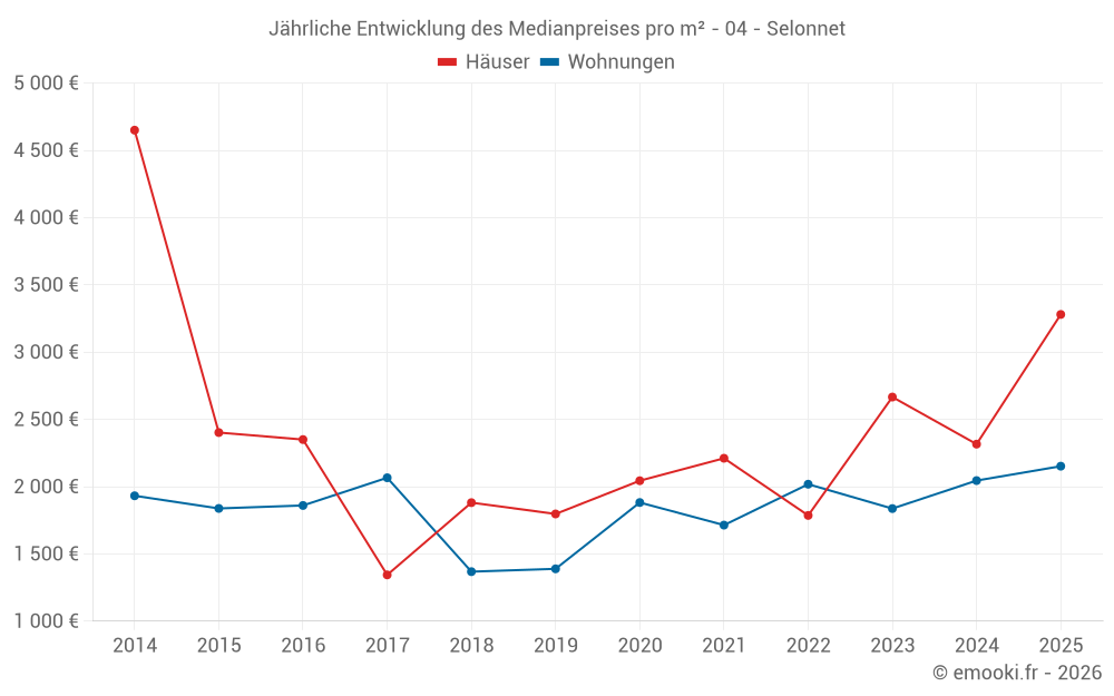 Der Durchschnittspreis auf den 35 Wohnungstransaktionen der letzten 24 Monate in der Gemeinde Selonnet betrug 2 043 € pro Quadratmeter für einen mittleren Immobilienwert von 47 000 €. Über diesen Zeitraum hinweg lagen 60% der Transaktionen zwischen 1 685 und 2 401 € pro Quadratmeter (vom 2. bis zum 8. Dezil).