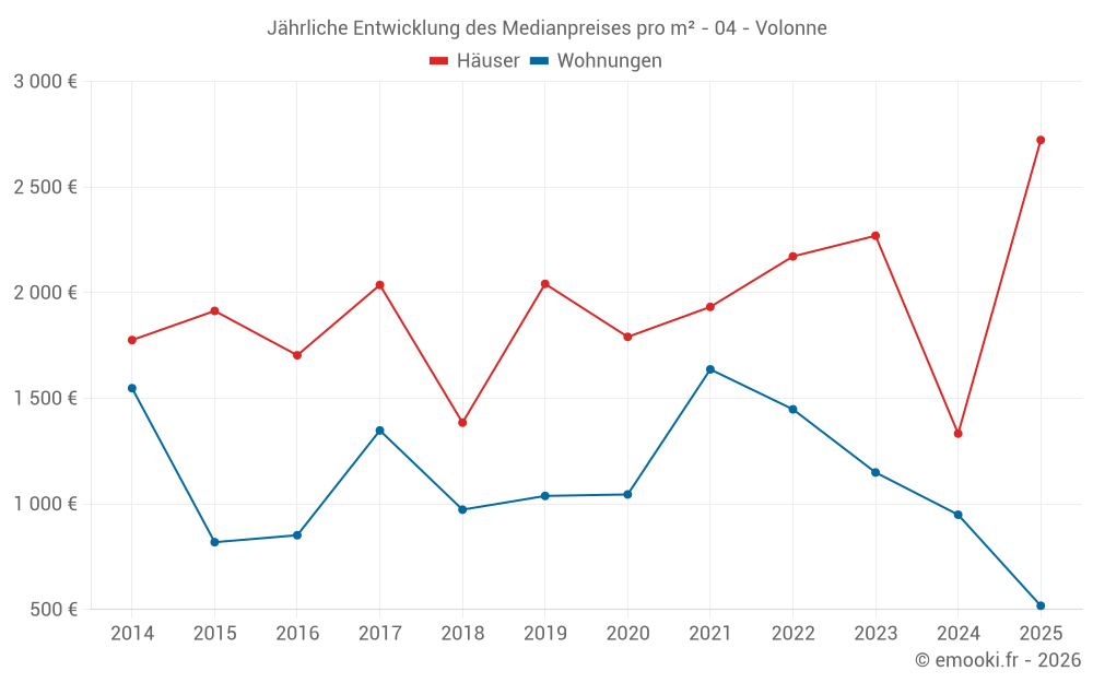 Der Durchschnittspreis auf den 26 Hausgeschäften der letzten 24 Monate in der Gemeinde Volonne betrug 1 992 € pro Quadratmeter für einen mittleren Immobilienwert von 127 050 €. Über diesen Zeitraum hinweg lagen 60% der Transaktionen zwischen 1 000 und 2 604 € pro Quadratmeter (vom 2. bis zum 8. Dezil).