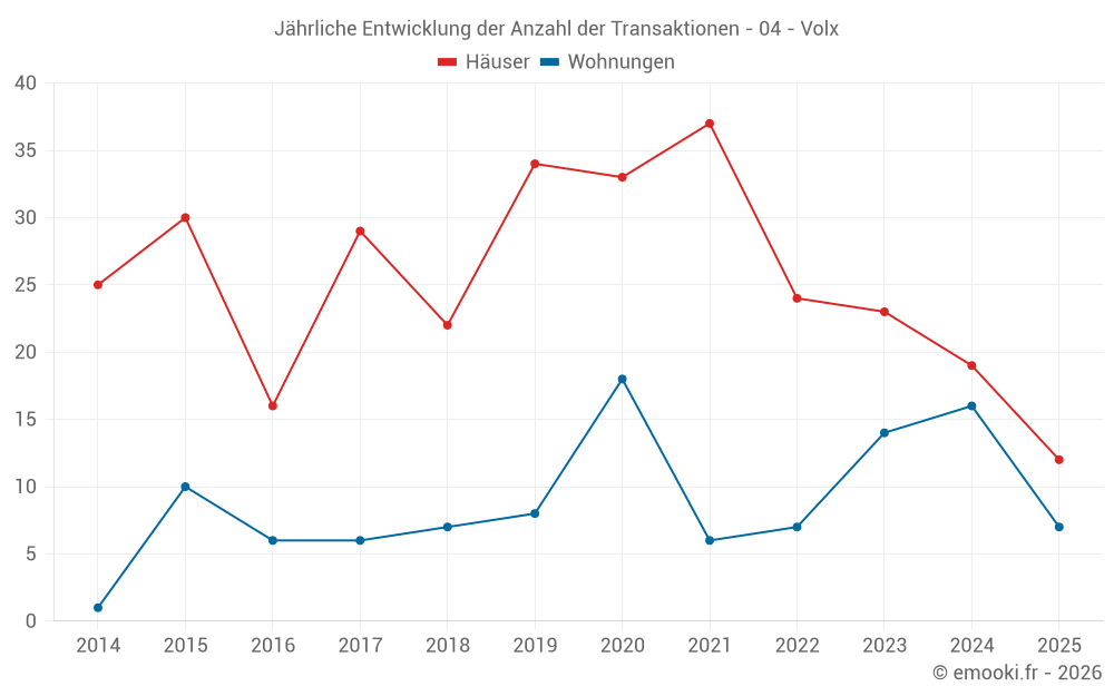 Der Durchschnittspreis auf den 25 Hausgeschäften der letzten 12 Monate in der Gemeinde Volx betrug 2 519 € pro Quadratmeter für einen mittleren Immobilienwert von 257 690 €. Über diesen Zeitraum hinweg lagen 60% der Transaktionen zwischen 1 846 und 3 108 € pro Quadratmeter (vom 2. bis zum 8. Dezil).