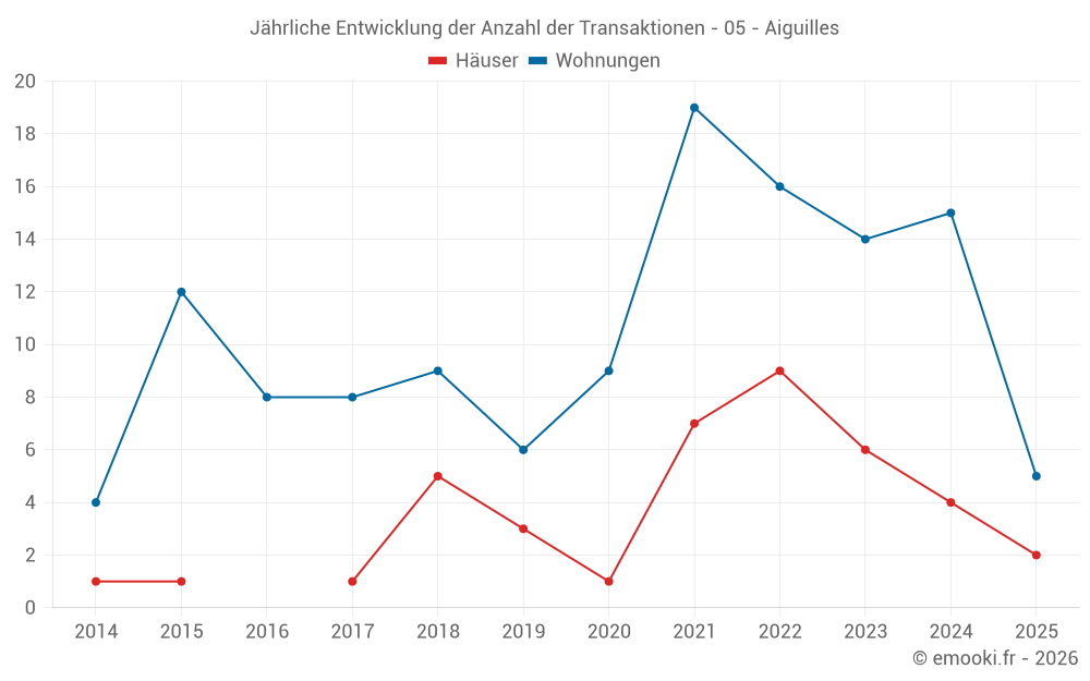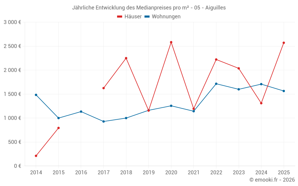 Der Durchschnittspreis auf den 16 Wohnungstransaktionen der letzten 12 Monate in der Gemeinde Aiguilles betrug 1 716 € pro Quadratmeter für einen mittleren Immobilienwert von 71 750 €. Über diesen Zeitraum hinweg lagen 60% der Transaktionen zwischen 1 552 und 2 237 € pro Quadratmeter (vom 2. bis zum 8. Dezil).