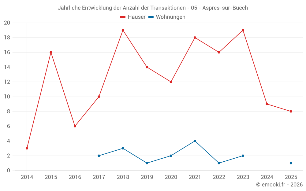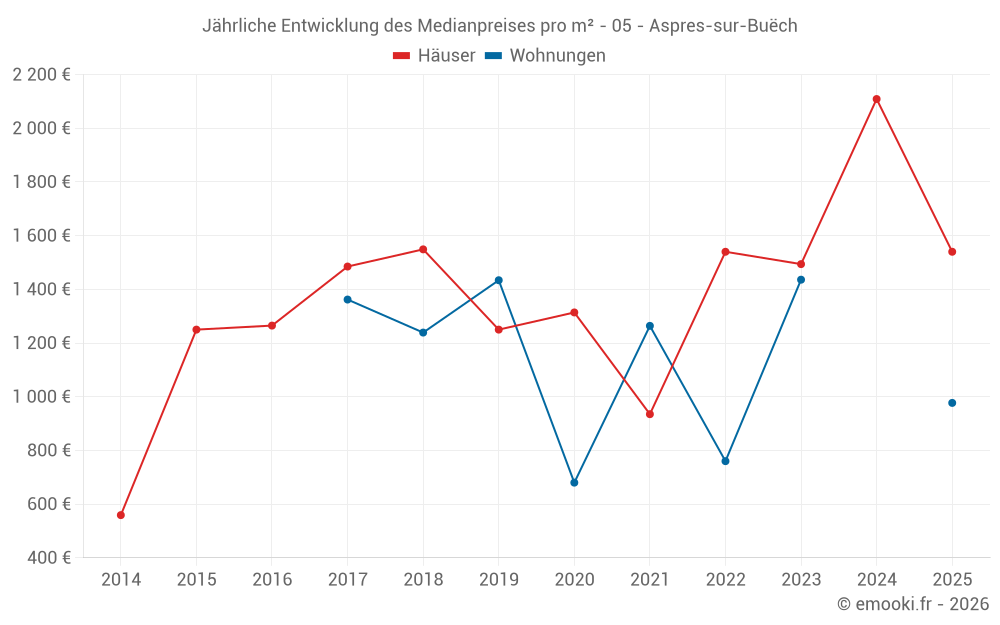 Der Durchschnittspreis auf den 30 Hausgeschäften der letzten 24 Monate in der Gemeinde Aspres-sur-Buëch betrug 1 642 € pro Quadratmeter für einen mittleren Immobilienwert von 129 000 €. Über diesen Zeitraum hinweg lagen 60% der Transaktionen zwischen 943 und 2 661 € pro Quadratmeter (vom 2. bis zum 8. Dezil).