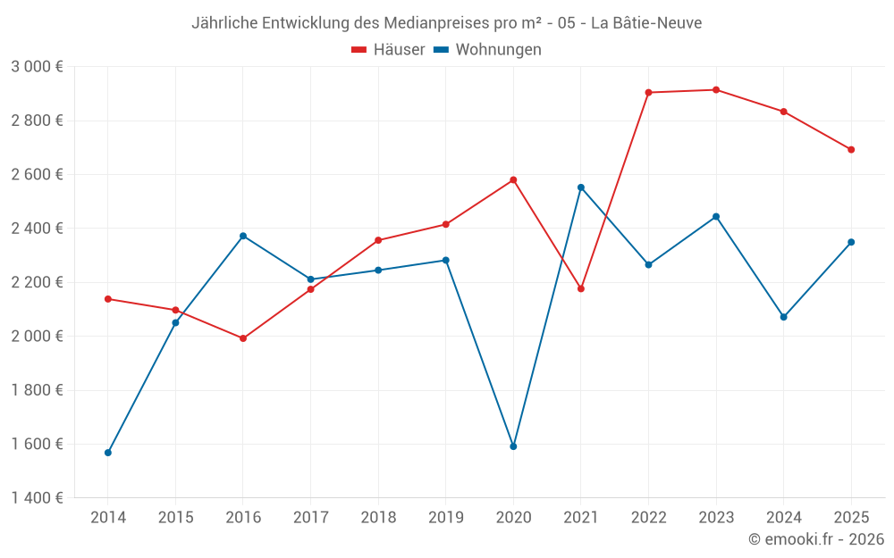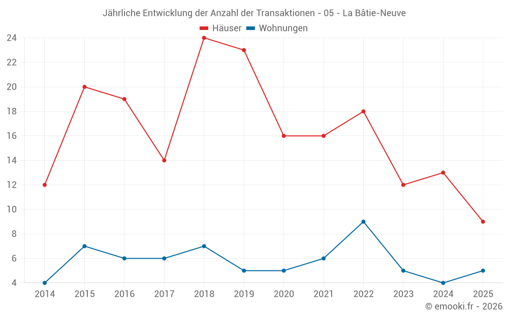 Der Durchschnittspreis auf den 29 Hausgeschäften der letzten 24 Monate in der Gemeinde La Bâtie-Neuve betrug 2 766 € pro Quadratmeter für einen mittleren Immobilienwert von 290 450 €. Über diesen Zeitraum hinweg lagen 60% der Transaktionen zwischen 2 156 und 3 691 € pro Quadratmeter (vom 2. bis zum 8. Dezil).