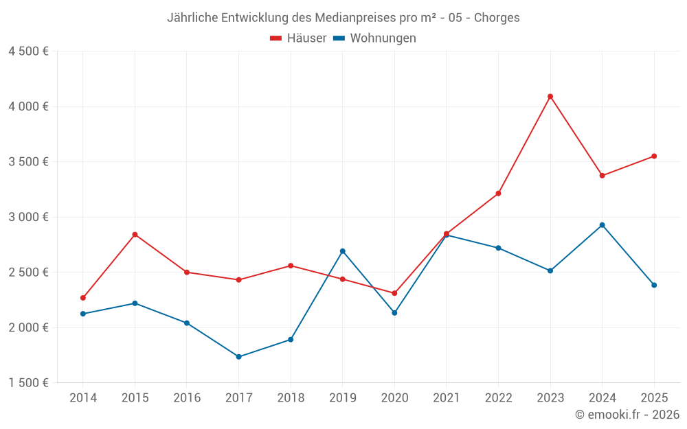 Der Durchschnittspreis auf den 24 Wohnungstransaktionen der letzten 24 Monate in der Gemeinde Chorges betrug 2 708 € pro Quadratmeter für einen mittleren Immobilienwert von 169 425 €. Über diesen Zeitraum hinweg lagen 60% der Transaktionen zwischen 2 203 und 3 494 € pro Quadratmeter (vom 2. bis zum 8. Dezil).