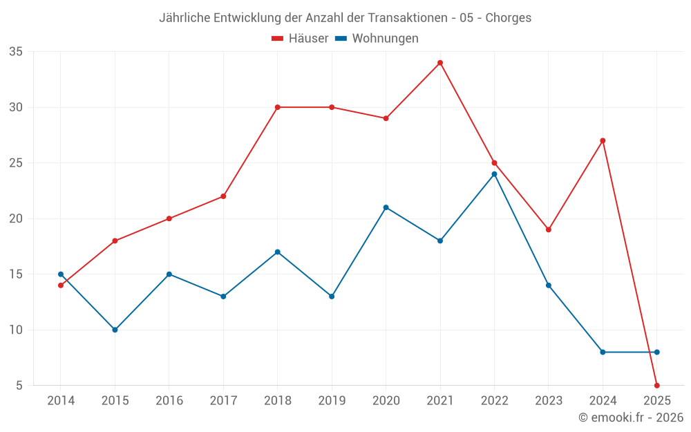 Der Durchschnittspreis auf den 23 Hausgeschäften der letzten 12 Monate in der Gemeinde Chorges betrug 3 422 € pro Quadratmeter für einen mittleren Immobilienwert von 335 000 €. Über diesen Zeitraum hinweg lagen 60% der Transaktionen zwischen 2 862 und 5 423 € pro Quadratmeter (vom 2. bis zum 8. Dezil).