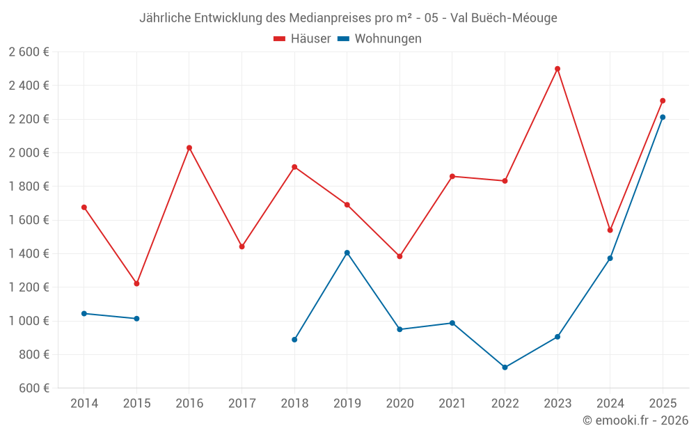 Der Durchschnittspreis auf den 22 Hausgeschäften der letzten 12 Monate in der Gemeinde Val Buëch-Méouge betrug 2 042 € pro Quadratmeter für einen mittleren Immobilienwert von 167 650 €. Über diesen Zeitraum hinweg lagen 60% der Transaktionen zwischen 1 346 und 2 656 € pro Quadratmeter (vom 2. bis zum 8. Dezil).