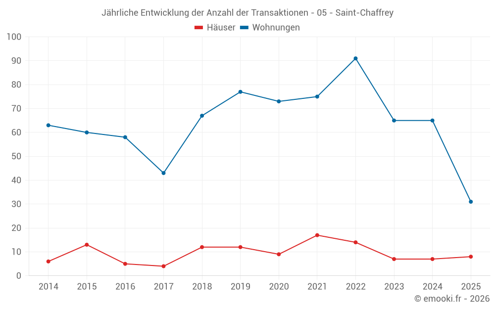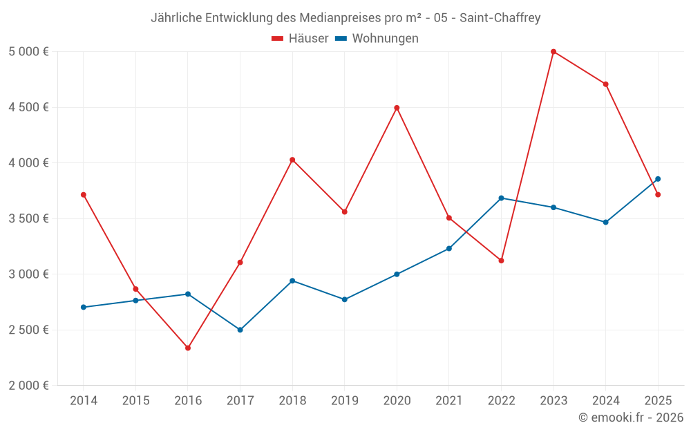 Der Durchschnittspreis auf den 21 Wohnungstransaktionen der letzten 3 Monate in der Gemeinde Saint-Chaffrey betrug 3 690 € pro Quadratmeter für einen mittleren Immobilienwert von 123 030 €. Über diesen Zeitraum hinweg lagen 60% der Transaktionen zwischen 2 308 und 5 388 € pro Quadratmeter (vom 2. bis zum 8. Dezil).
